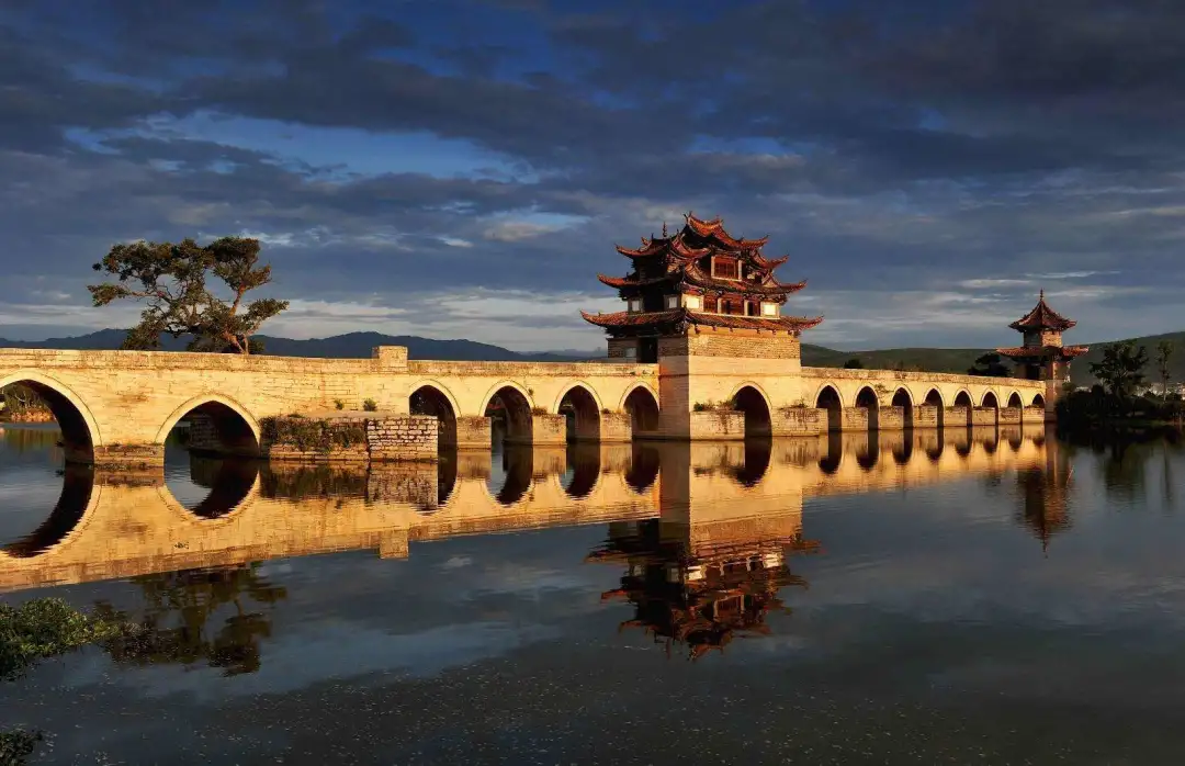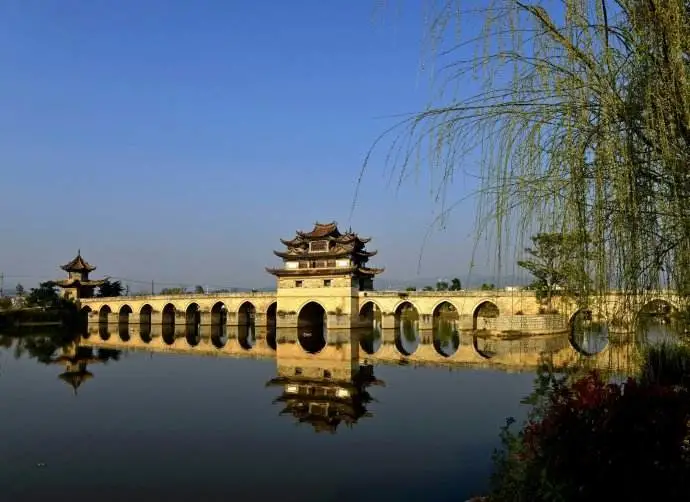 【双龙桥】俗称“十七孔桥”,是座三阁十七孔大石拱桥。它坐落于建水古城城西5里处,横跨泸江与塌冲河交汇之水面上,是云南省著名古迹之一