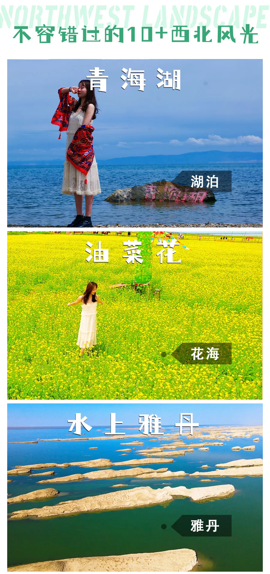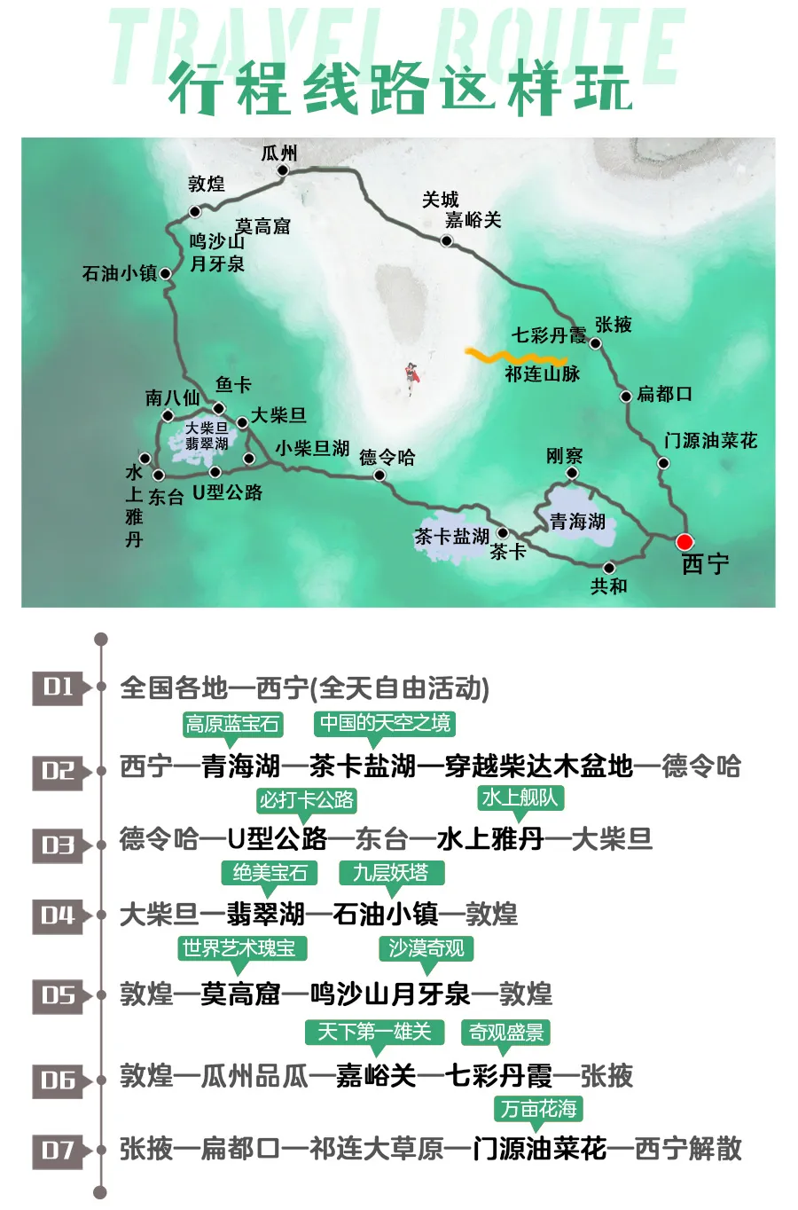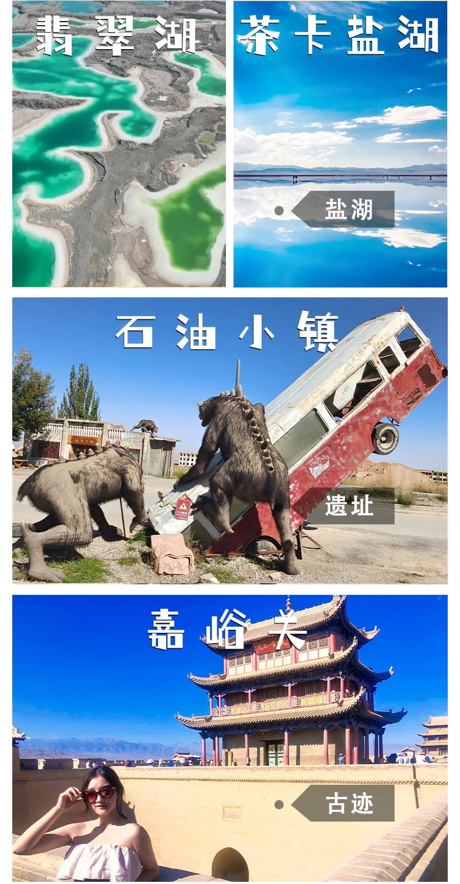 【门票】所列景点首道大门票:茶卡盐湖、大柴旦翡翠湖、鸣沙山月牙泉、张掖七彩丹霞、石油小镇、水上雅丹。