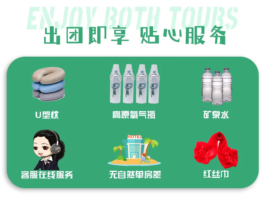 【随车赠送】每人一个U型枕,随车配拍照红丝巾,随车配氧气瓶,随车配矿泉水。(赠送项目如遇特殊原因未能赠送不退费用)