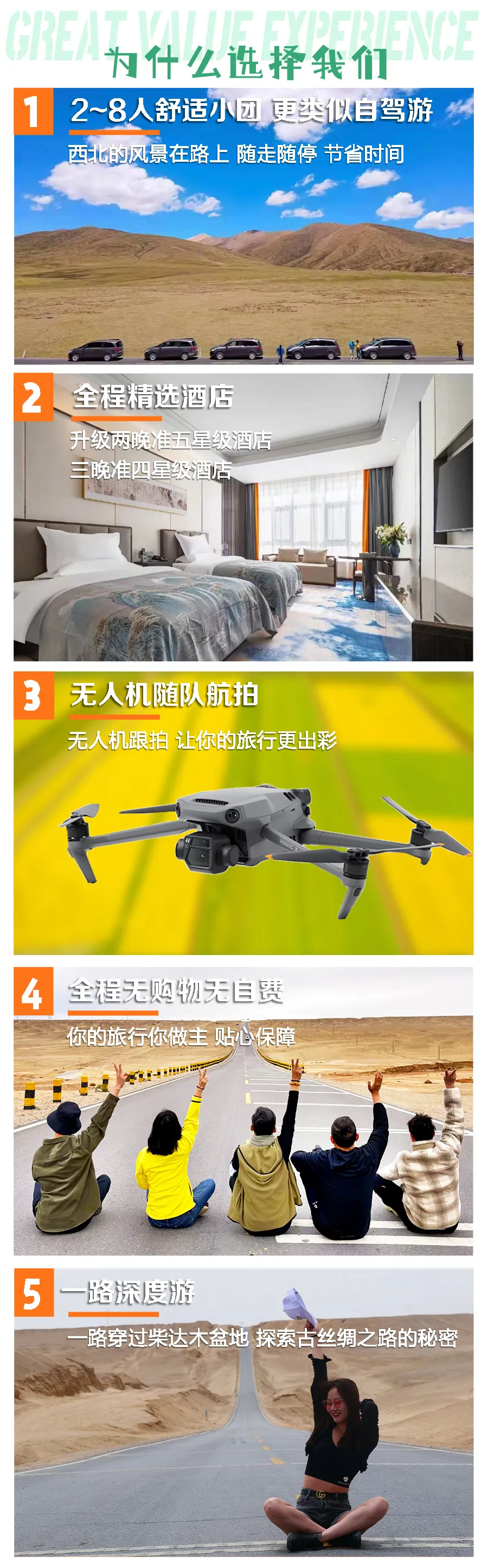 【无人机】随队配备无人机,每3到4台车一部无人机,司机师傅会在青海湖、U型公路、石油小镇、祁连大草原负责给客人航拍,其他景点司机师傅不进景区。(不保证随车配,如需随车配无人机拍摄,需要加100元每人并提前3天以上确认/进景区拍摄需单独出门票费用)
