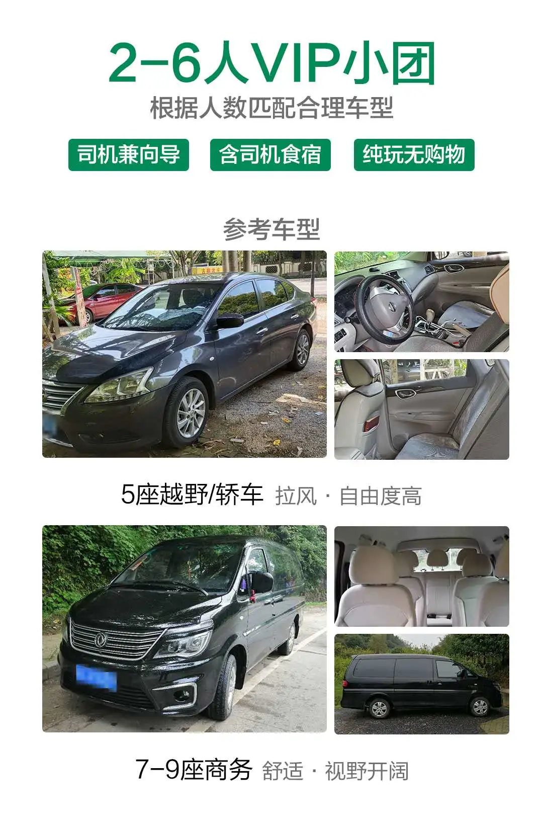 【用车】:用车将根据人数安排5-8空调车,保证每人1正座。