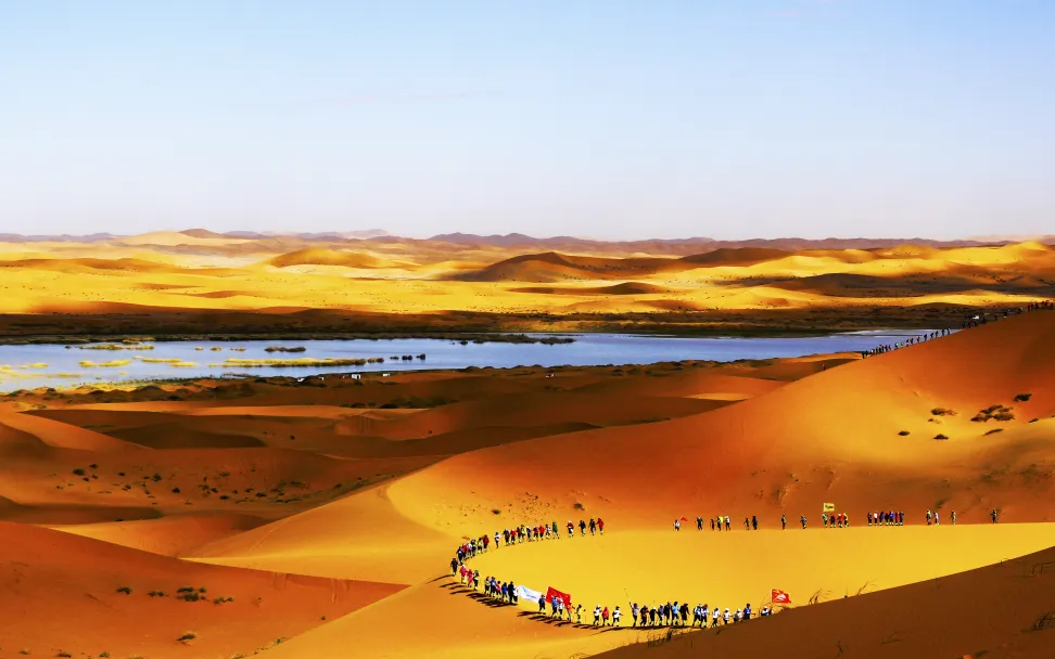 7:30所有队友从酒店集合准时出发,前往内蒙古阿拉善左旗,预计2.5小时左右可抵达徒步起点,分发沙套、魔术头巾、登山杖、排汗体恤,之后用午餐,午餐后跟随领队前往沙漠徒步起点处开始做热身运动,今日徒步全天行程15公里,匀速5-6小时即可到达营地,夜宿小天鹅湖营地。今日我们可以在小天鹅湖营地拍摄我们在沙漠腹地的第一次日落。