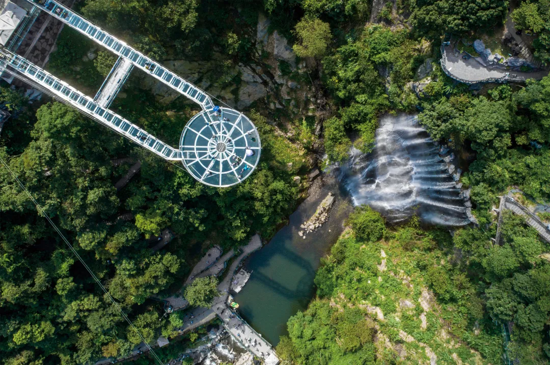 玻璃平台全长202米,悬空跨度72米,为美国科罗拉多大峡谷的U形桥(21米)的3.5倍,顶部是一个直径16.8米的玻璃平台,从底部仰视犹如天外来客。