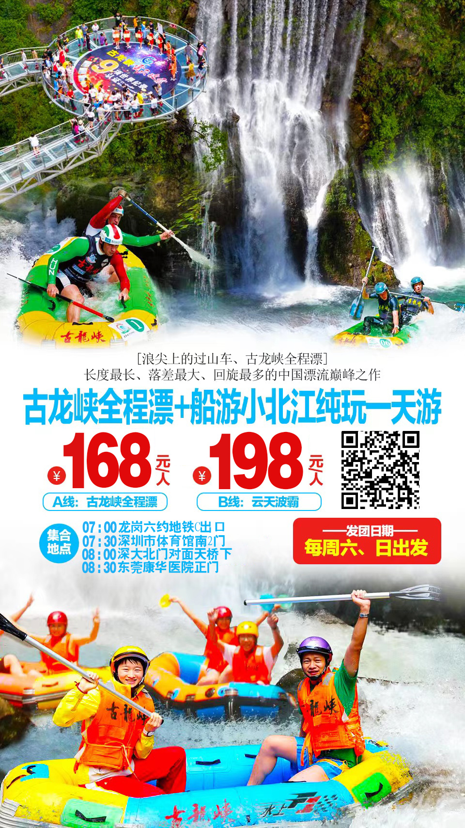 A路线古龙峡全程漂流,风景名胜古龙峡漂流,是广东最刺激的漂流,没有之一。高差达千米的古龙大峡谷赋予了漂流与众不同的特色,集瀑布、深潭、奇石、丛林、珍稀植物于一体,悬崖对峙、奇峰耸立、滩多水急,银瀑飞溅,人随艇飞,移步换景,自然景色之美令人为止震撼。