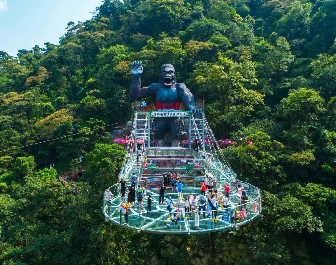 天王巨猩矗立在UFO造型的玻璃平台后方,用粗壮的臂膀紧紧拉住平台的底座,背山面瀑、叱咤风云,展示出威风凛凛的王者风范,寓意着吉星(猩)高照。